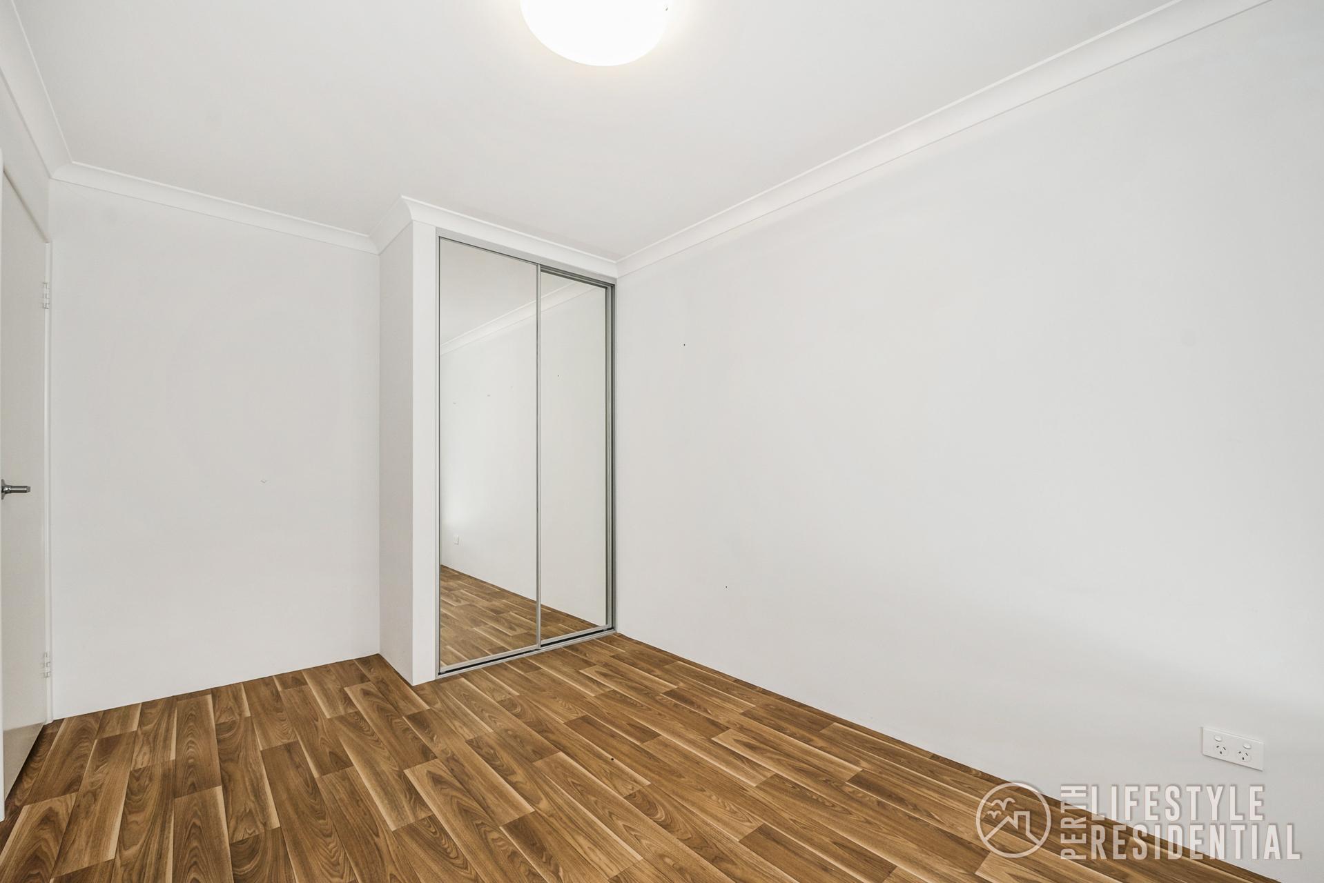 The main bedroom features a walk-in wardrobe, while the second bedroom is well sized and includes a built-in wardrobe with full-length mirrored doors.