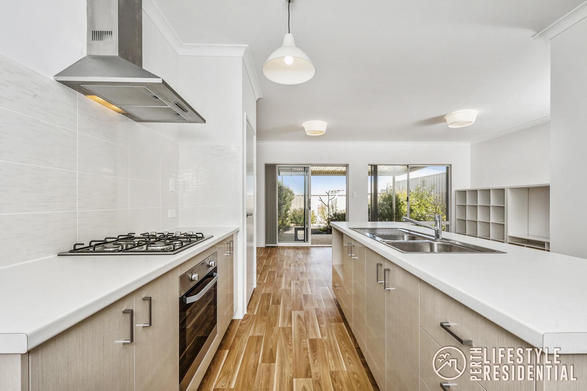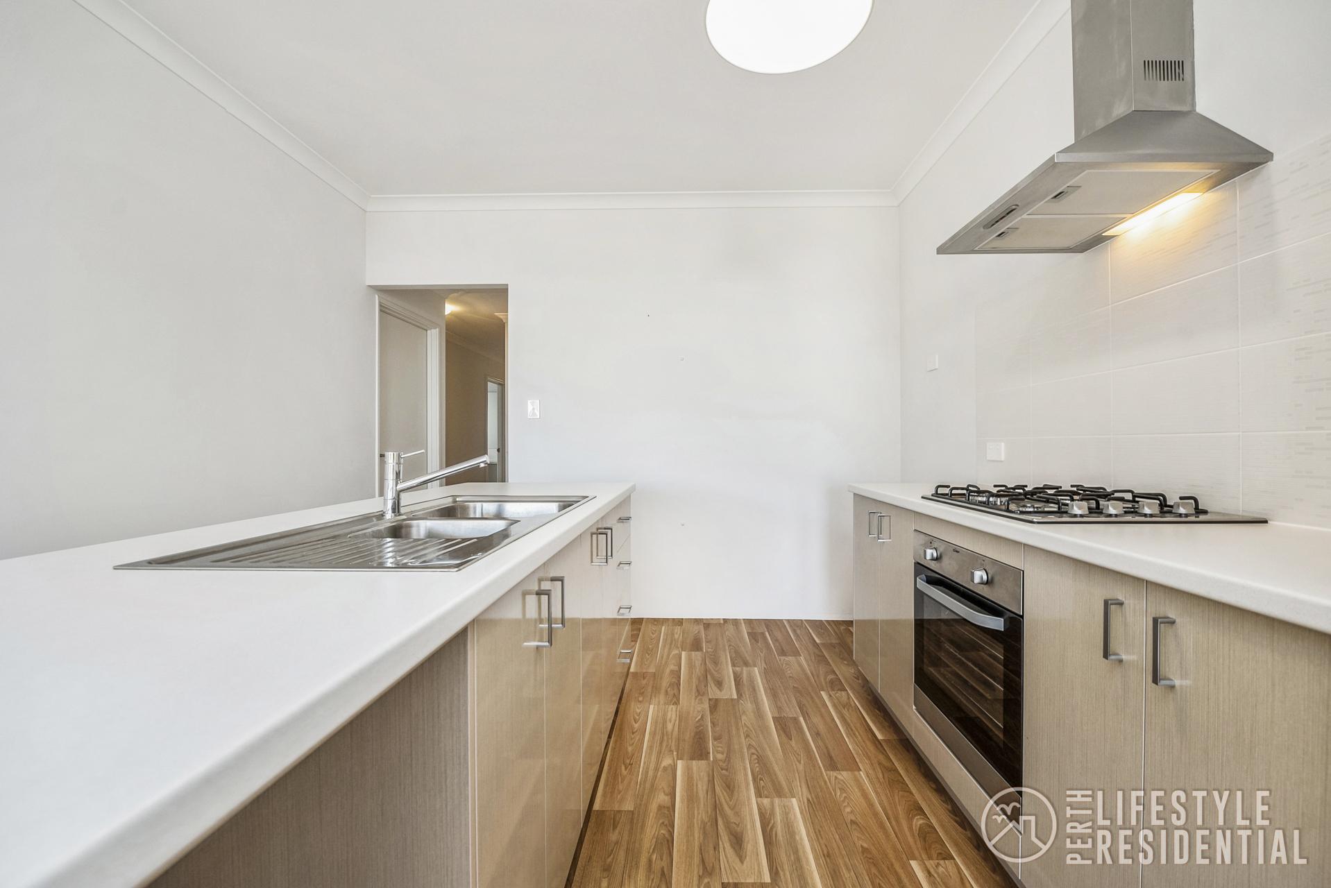The kitchen is modern and practical, featuring easy-to-maintain white laminate benchtops, stainless steel oven, cooktop and rangehood, along with ample cupboard space for storage.
