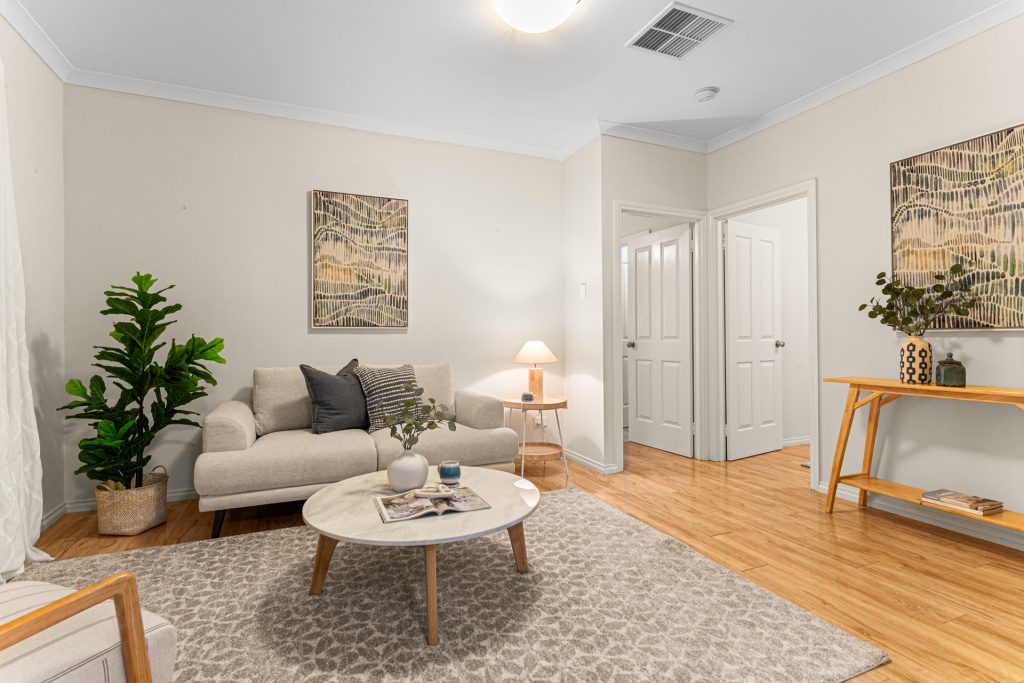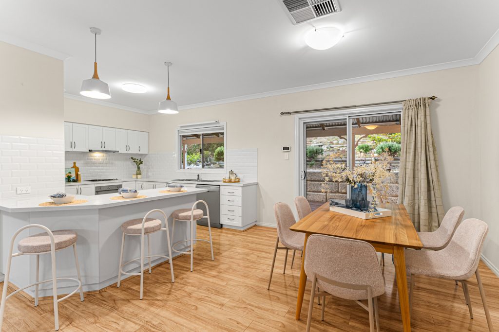At the heart of the home sits an open plan kitchen, dining and living area. The kitchen is well equipped with an electric oven, gas cooktop, range hood, dishwasher, overhead cupboards and a dedicated fridge recess. A large laundry with generous storage is positioned nearby.