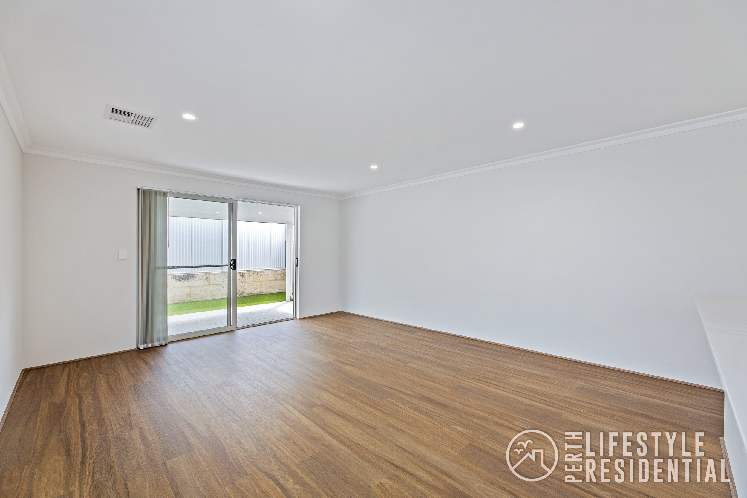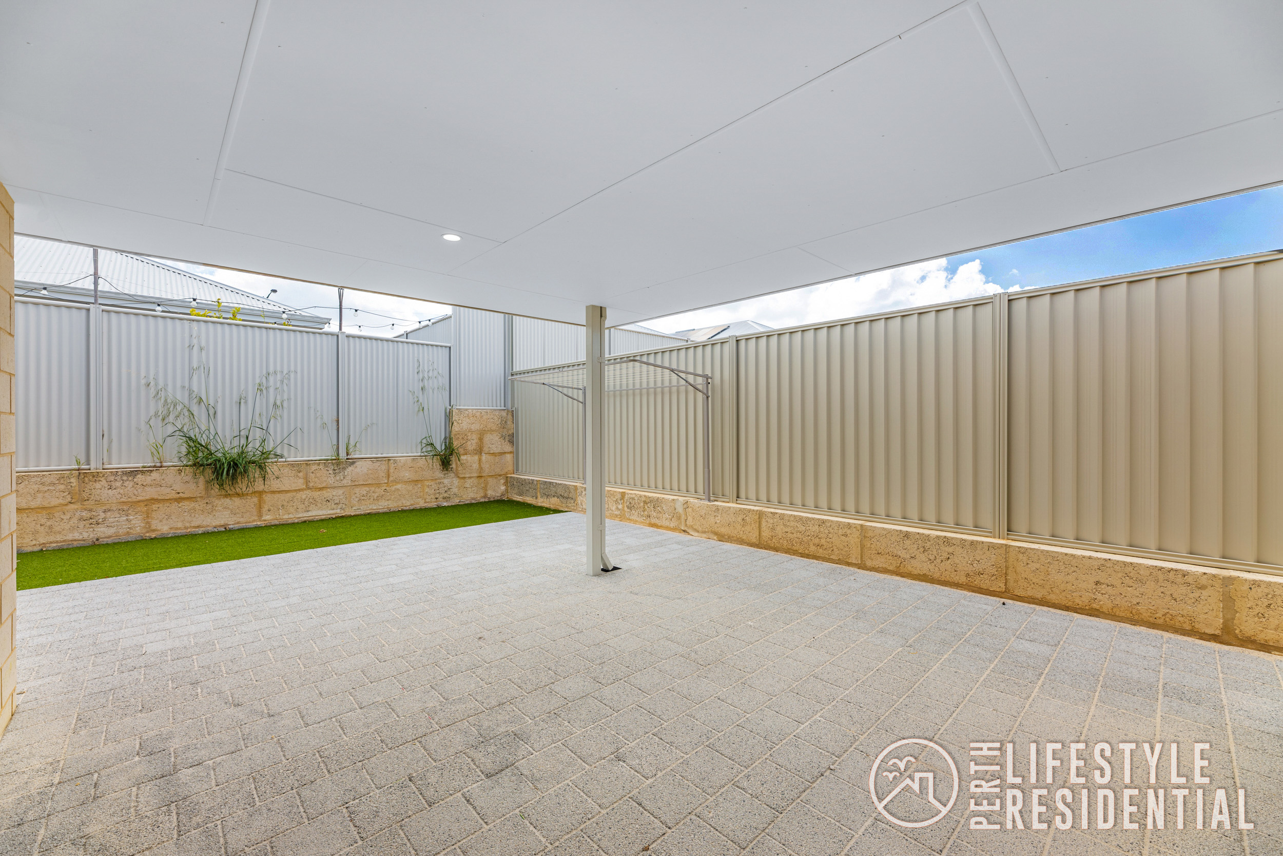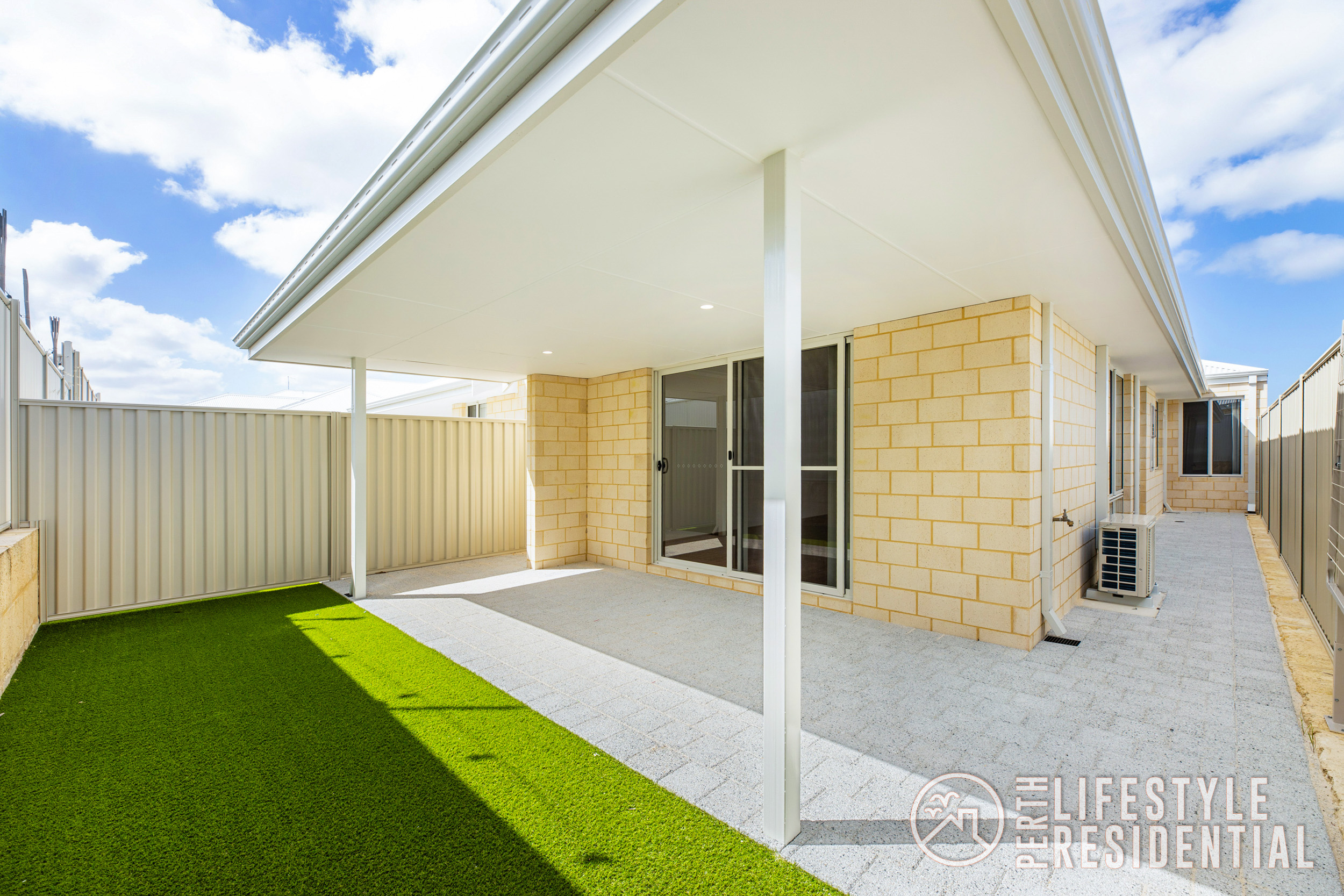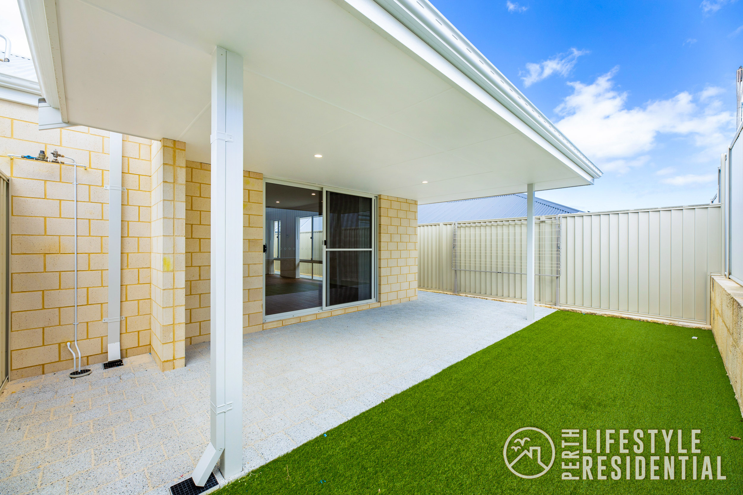 Stepping outside, a generous alfresco area overlooks low-maintenance artificial lawn, creating a private outdoor space ideal for relaxing or entertaining.