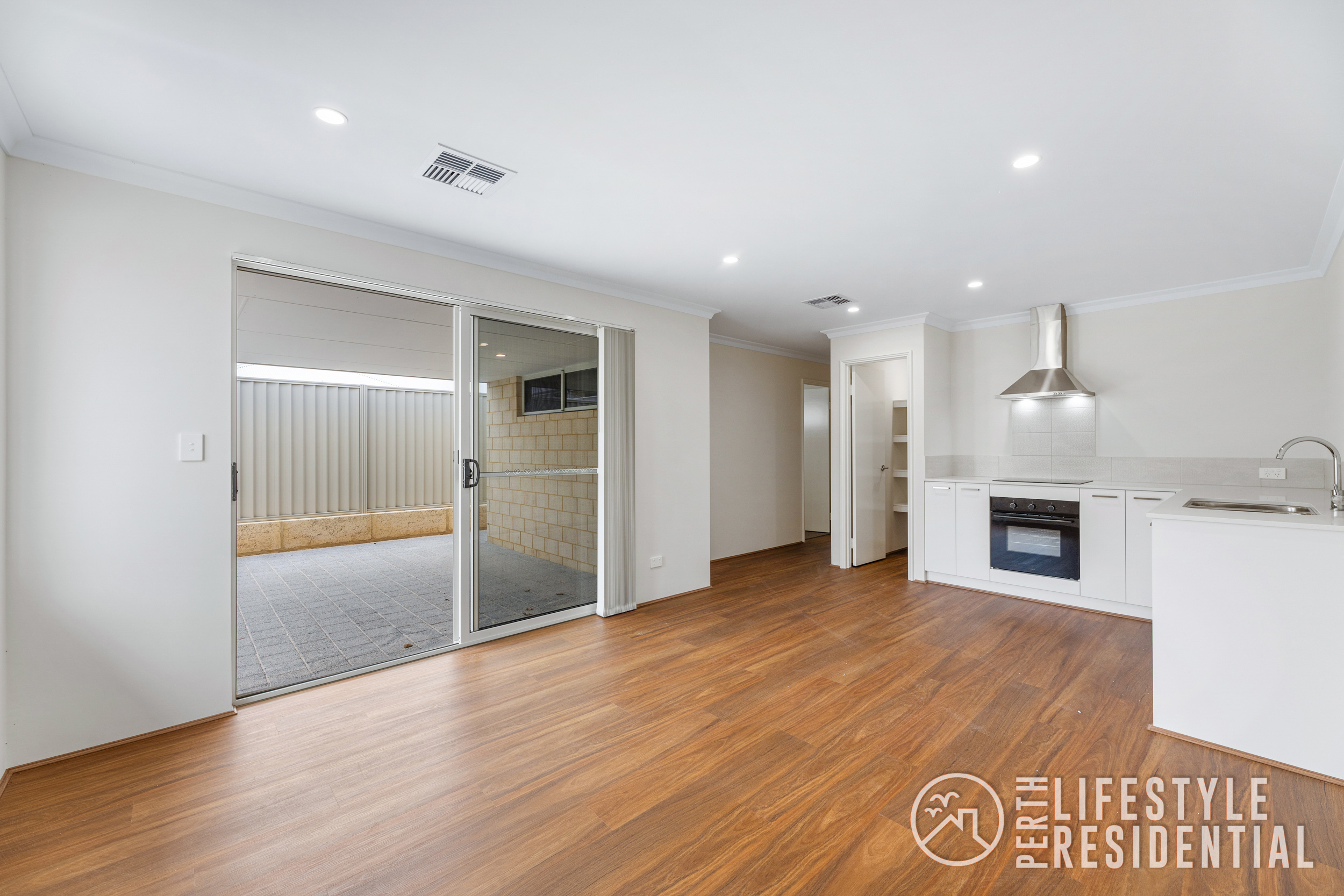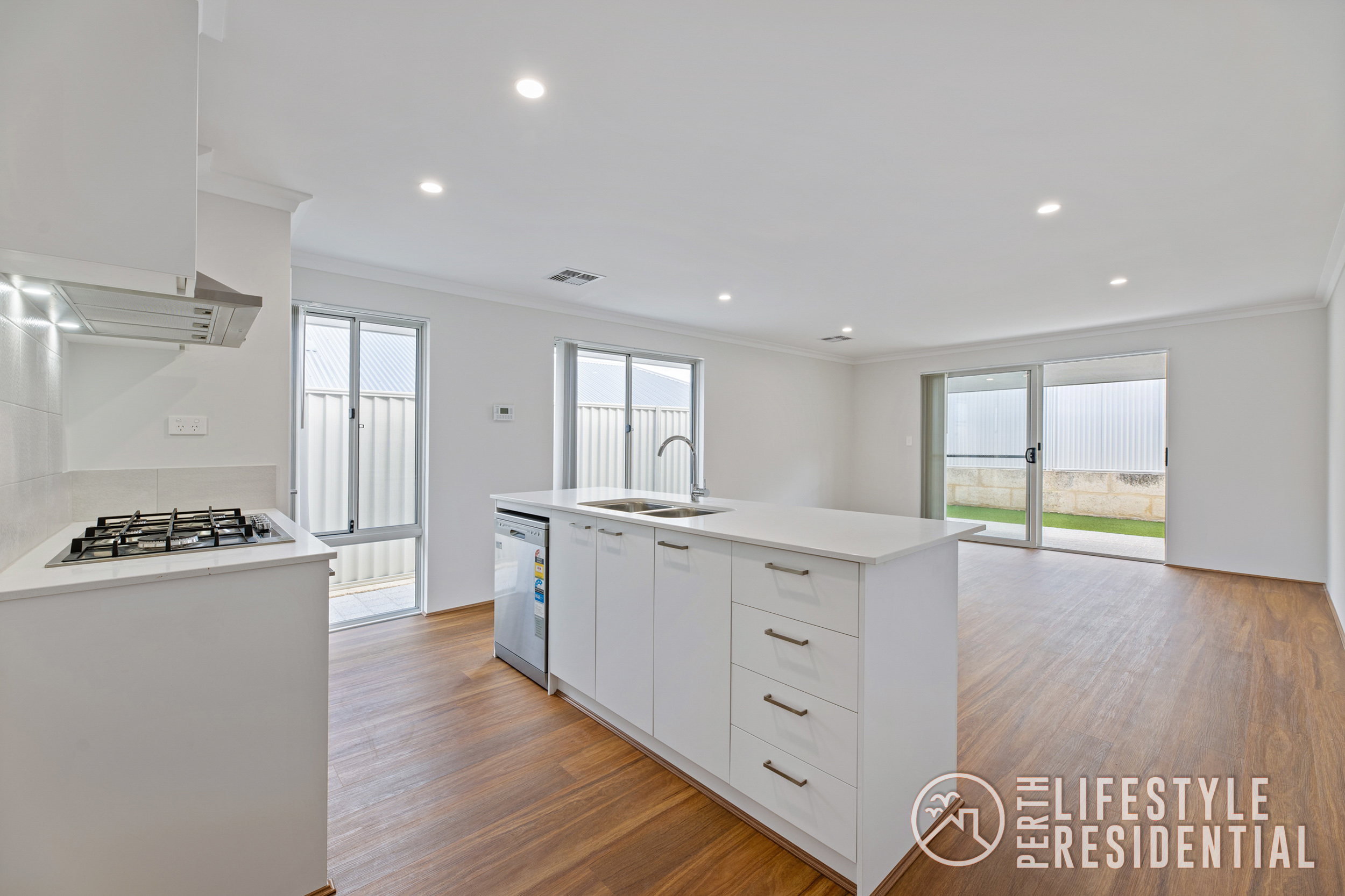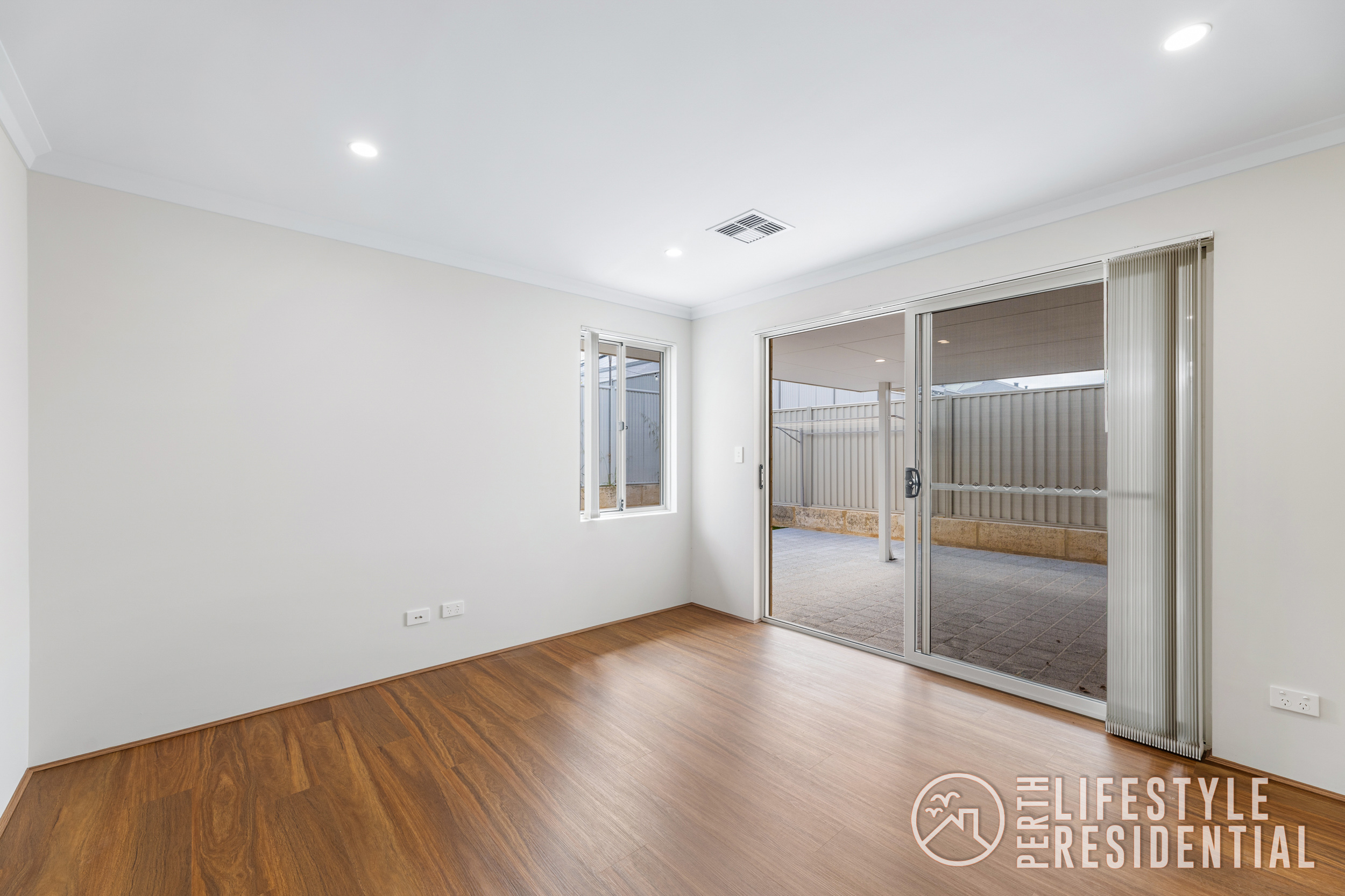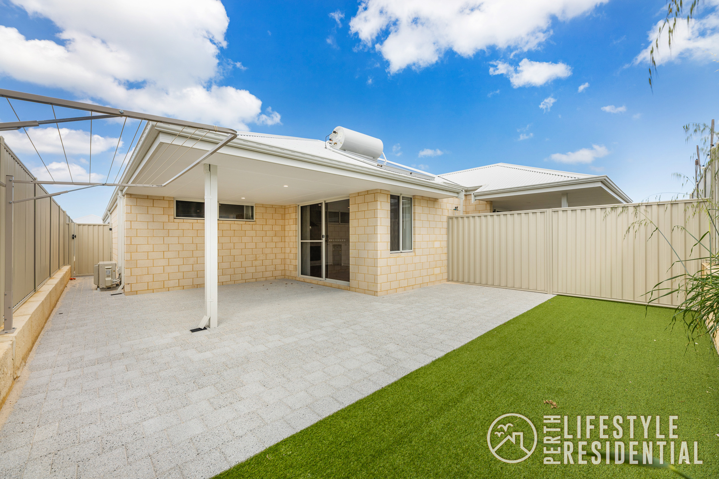 Stepping outside, a generous alfresco area overlooks low-maintenance artificial lawn, creating a private outdoor space ideal for relaxing or entertaining.