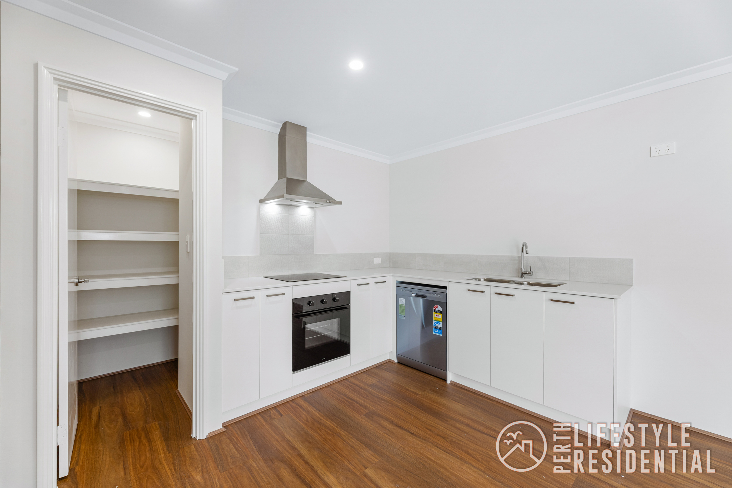 The modern kitchen is well-appointed with stone benchtops, a walk-in pantry, electric stove, oven, rangehood and dishwasher. An internal laundry with built-in shelving adds practicality and extra storage.