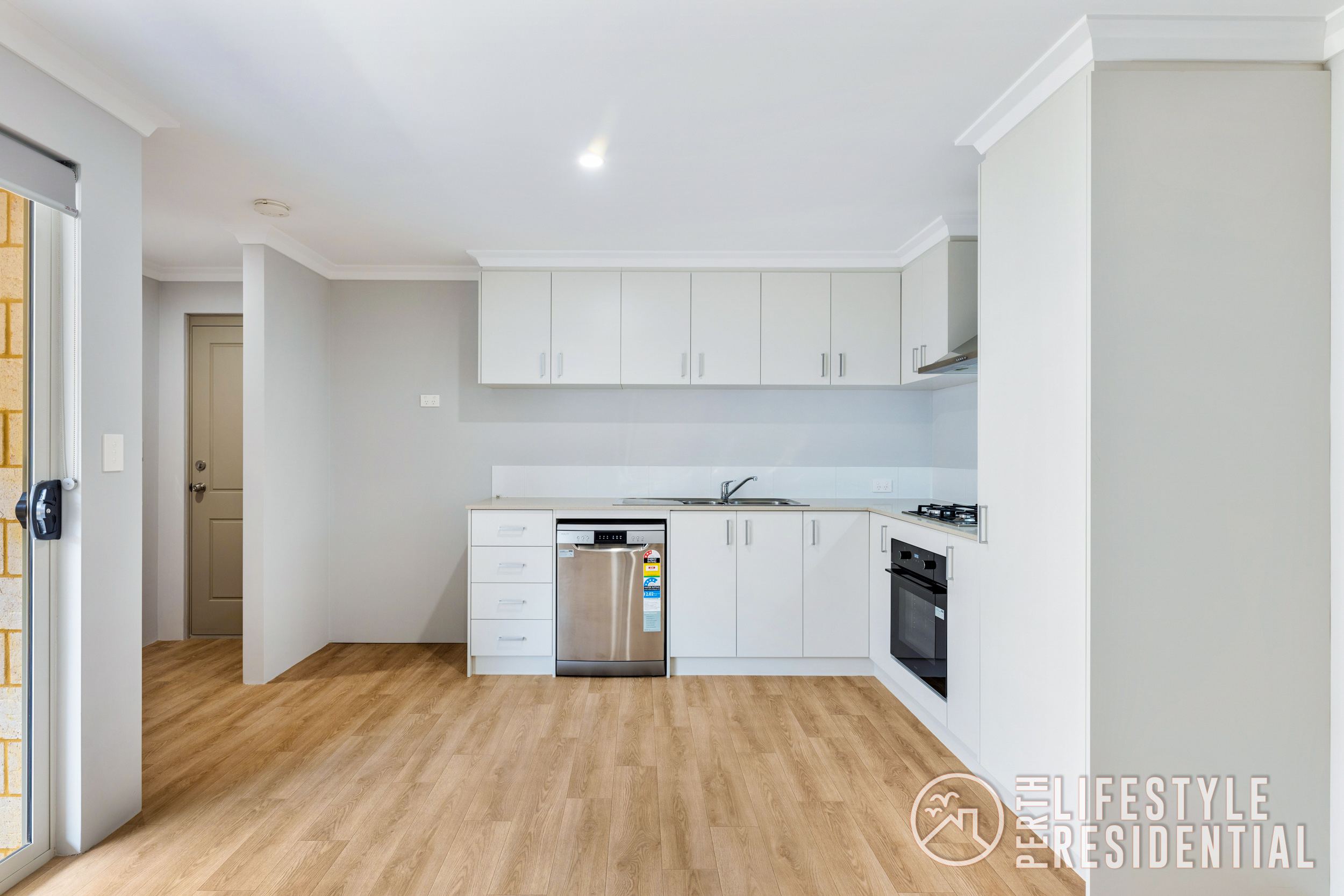 • Kitchen with gas hotplate, dishwasher and stone benchtops